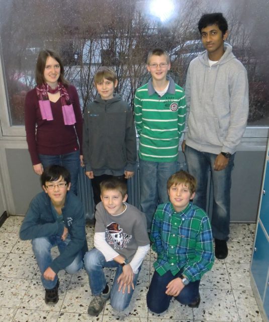 Unsere Olympioniken sind (kniend, von links nach rechts) Andreas Maier (6c), Simon Lachnit (6d), Lennart Seeger (7b) sowie (stehend, von links nach rechts) Theresa Schüler (Stufe 13), Joshua Speckels (6d), Jonas Schroeder (6a)und Yathavan Satgunarajah (Stufe 13).