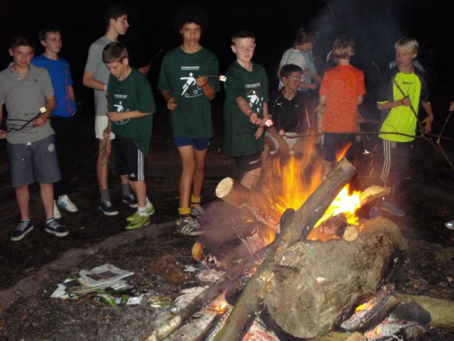 Englische, holländische und deutsche Jungs vereint am Lagerfeuer.